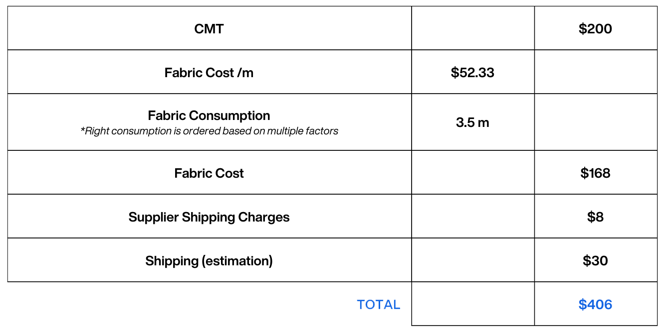 This example represents the real cost to produce and receive the garment. It does not include margin, overhead or revenue for the business.